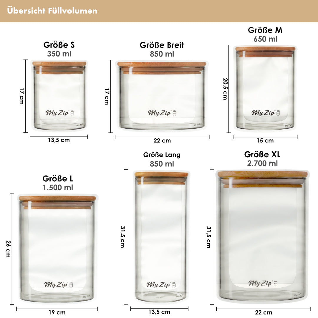 Das Fassungsvermögen der MyZip-Beutel beträgt 350 ml (Größe S) bis 2.700 ml (Größe XL).
